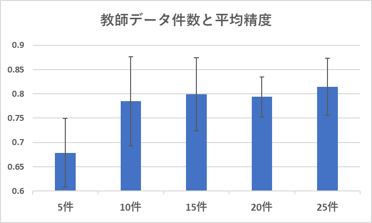 ・教師データ数の増加に比例した精度向上が確認できた。例えば、教師データ25件の平均精度は81%となった。